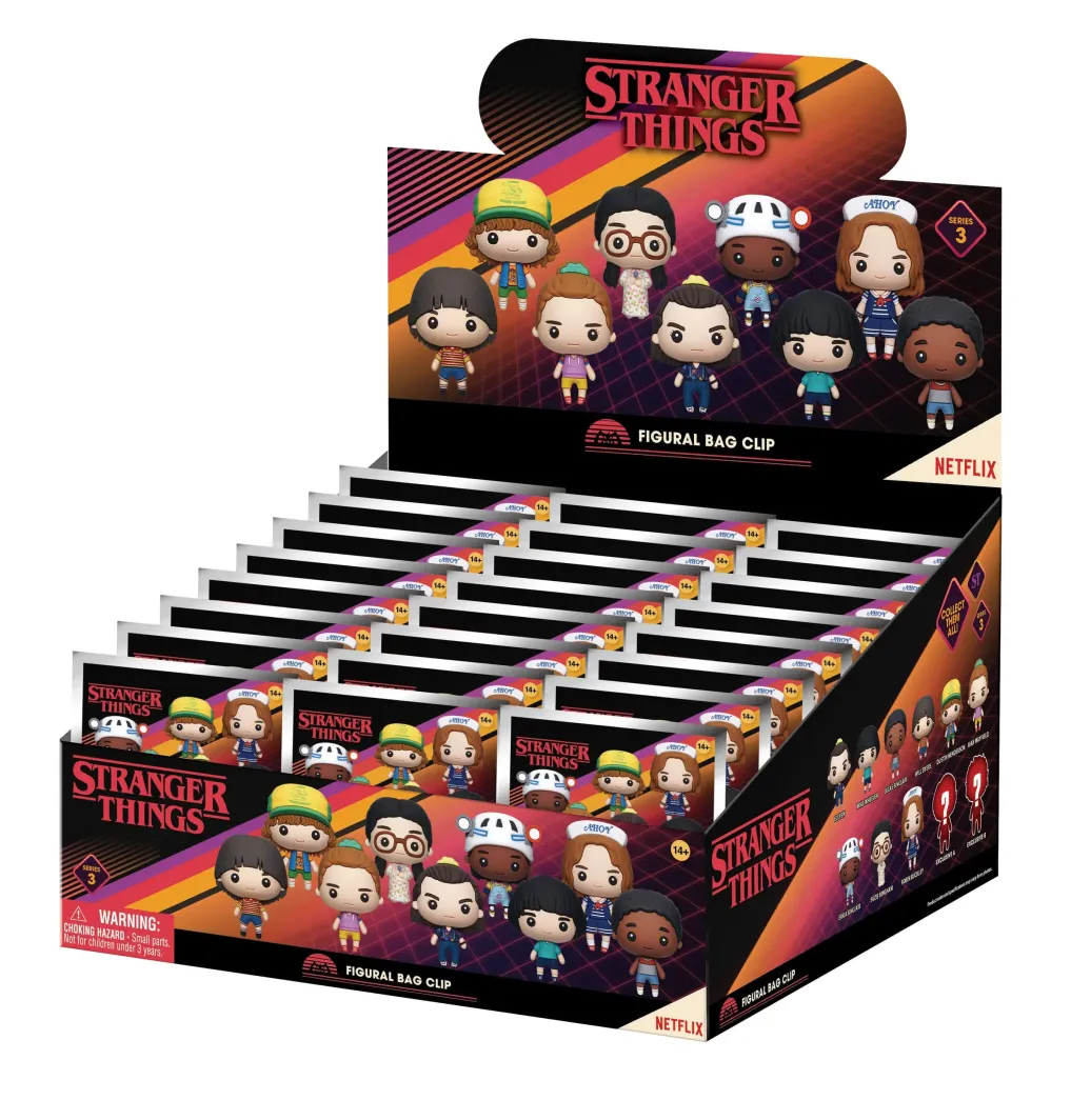 Display mit 24 Blind Bags mit je einem offiziell lizenzierten Taschenanhänger aus PVC.
