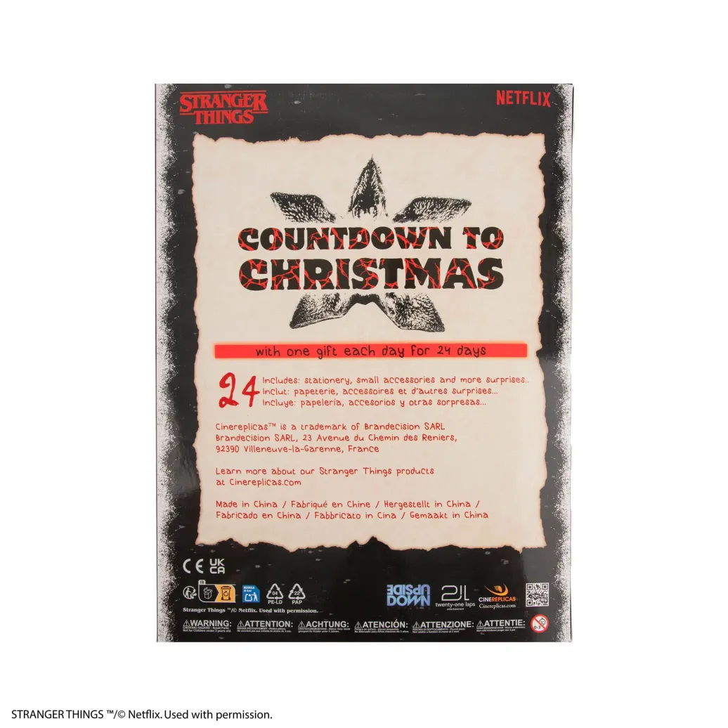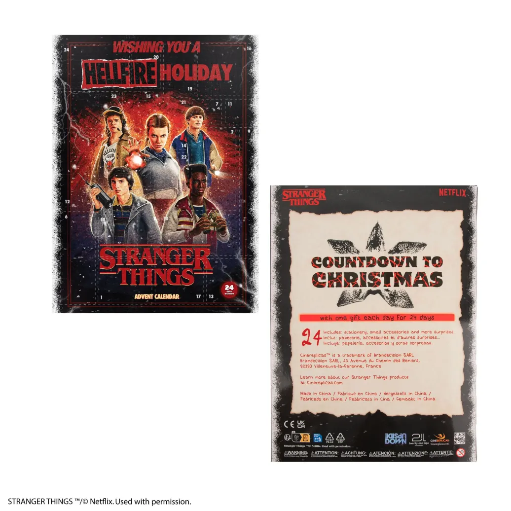 Offiziell lizenzierter Adventskalender mit 24 Geschenkartikeln zum Thema Stranger Things (Schuhbeutel, Schlafaugenmaske, faltbare Wasserflasche, Radiergummi, Papierbrille, Acryl-Schlüsselanhänger, Armband, Mini-Squishy, Schnürsenkel, Aufkleber, Maßband, Washi-Tape, linsenförmiges Lesezeichen, gewebter Aufnäher, Acrylfigur, Kordelzugbeutel, Anstecknadel, Spiegel, Stift, Magnet, Gepäckanhänger, Kugelkette, Cupcake-Topper, Socken)
