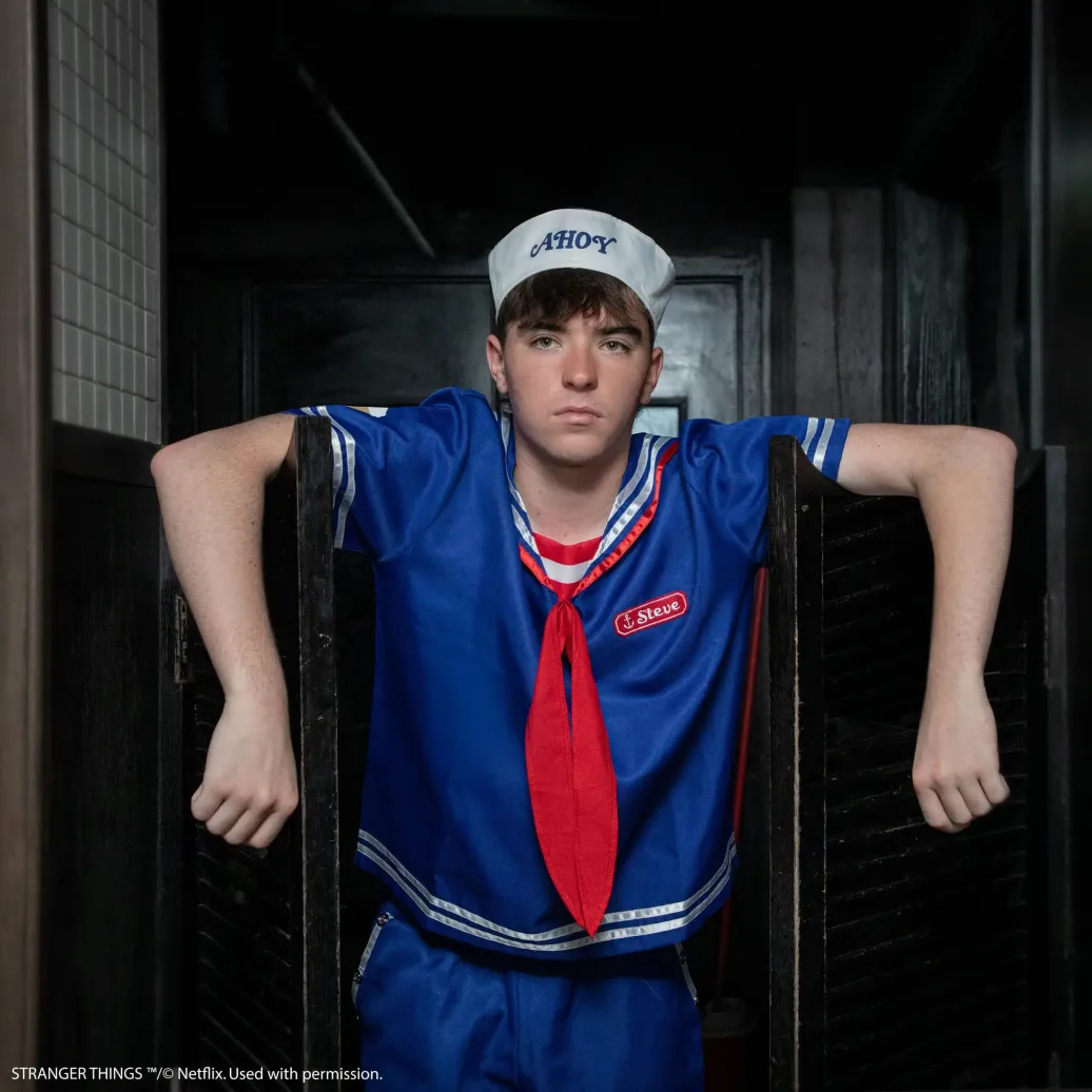 Verkörpere den Charme und die Ausstrahlung von Steve Harrington, während du in dieses Ensemble schlüpfst, das dafür entworfen wurde, dich in die geschäftige Welt der Vintage-Eiscremeparlors zu versetzen.