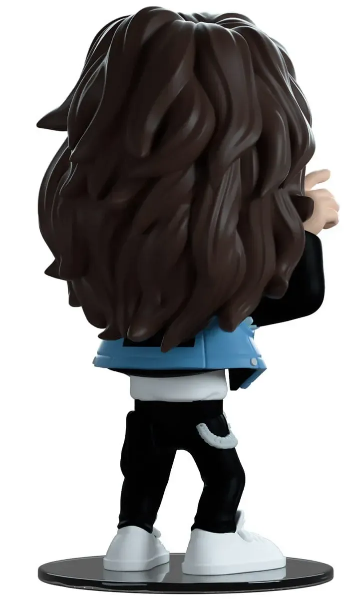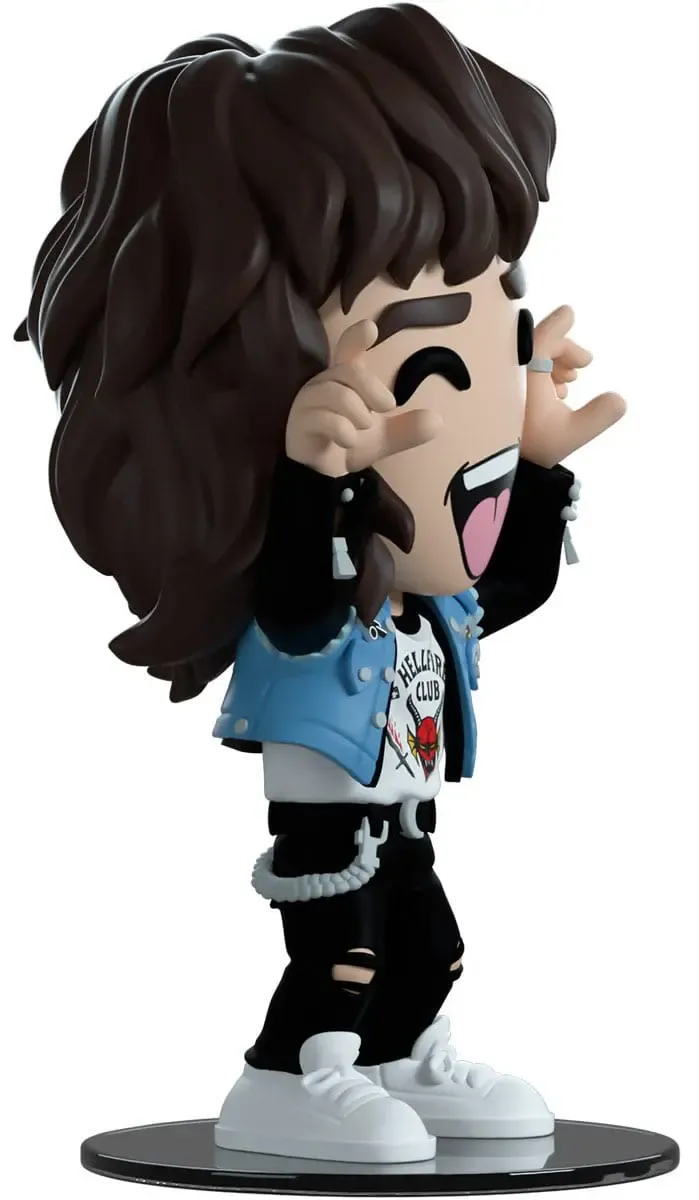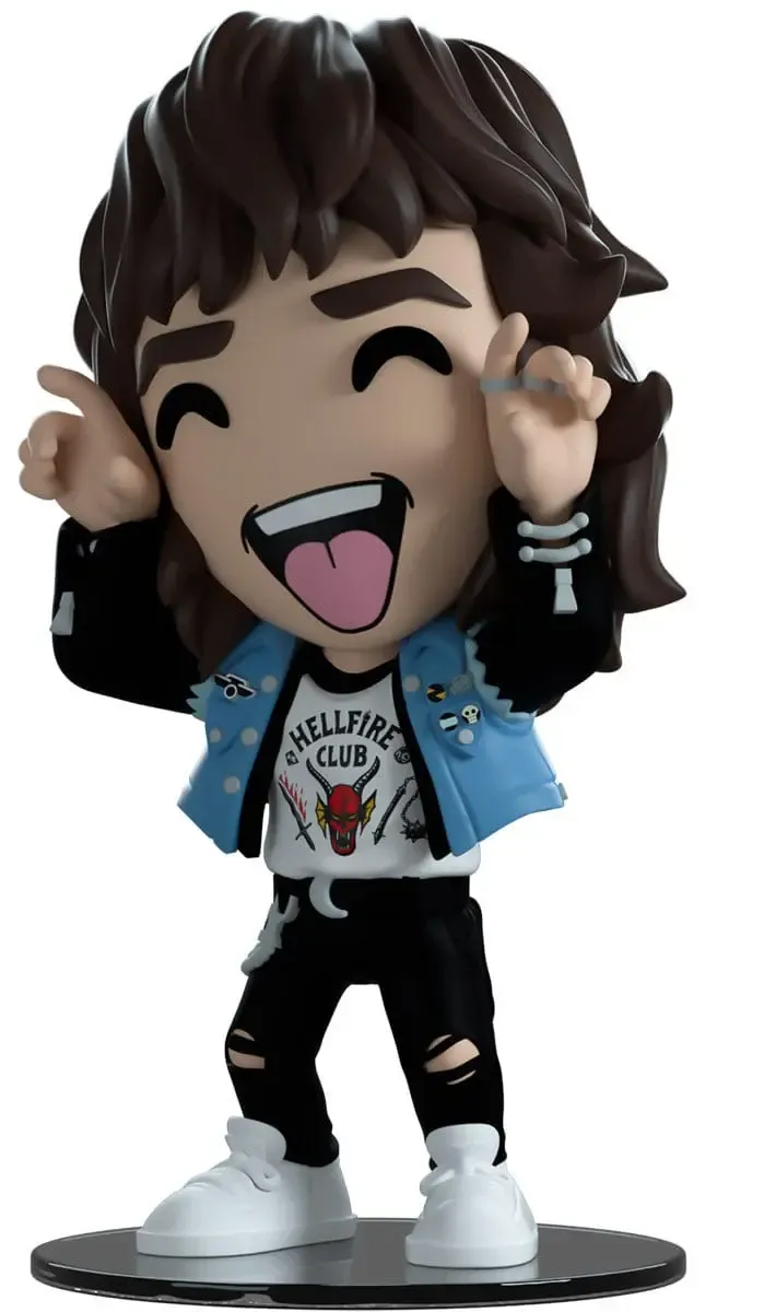 Eddie hat sich als Teil seiner neuen Kampagne auf Youtooz zurückgemeldet! Er hebt seine beringten Hände hoch, um Hörner auf beiden Seiten seines Gesichts zu formen und streckt seine Zunge heraus. Er ist 4,7 Zoll groß und hat einen Schopf dunkelbrauner Haare, die in einer dicken Welle über seinen Rücken fallen. Er trägt die süßeste blaue ärmellose Jeansweste mit Patches und Pins über einer schwarzen Jacke und einem weißen Hemd mit dem Hellfire Club-Logo auf der Vorderseite, seine engen schwarzen Jeans sind an den Knien zerrissen und mit einer dicken silbernen Kette und einem schwarzen Bandana geschmückt. Das Äußere seiner Verpackung zeigt ihn auf den Mittagstischen einer hell erleuchteten Cafeteria, während das Innere schwarzer klebriger Schleim ist, der in Ranken über einen schwarzen Hintergrund läuft. Die Schutzhülle stellt das Upside Down mit einem verfallenen Haus und spindelnden Bäumen nach, während seine Figur durch das große, durchsichtige Schaufenster auf der Vorderseite zu sehen ist. Dieses Sammlerstück wird in einer matten, geprägten, schützenden Außenhülle und einer maßgefertigten Kunststoffhülle für maximalen Schutz beim Versand geliefert.
