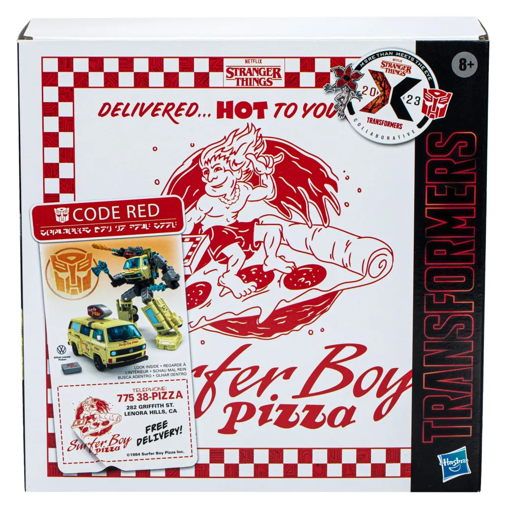 In dem Stranger Things x Transformers Code Red Mash-Up-Pack trifft die Welt der Transformers Roboter auf die von Stranger Things! Der kultige Surfer Boy Pizza Van aus Stranger Things wird hier zum Transformers Roboter! Die Figur lässt sich vom Roboter in den Zweitmodus, einen der Serie nachempfundenen lizenzierten Volkswagen Vanagon, verwandeln und fasziniert mit filmgetreuen Design und Details. Der Pack beinhaltet Zubehör im Look zur Serie, wie eine Keule, Axt, Surfer Boy Pizza Blaster und Pizza-Schachtel sowie einen Blast-Effekt. Transformers Roboter faszinieren schon immer mit der Power der Verwandlung, aber jetzt können die Fans erleben, wie sich diese herausragenden Charaktere dank der Transformers Collaborative mit anderen Charakteren, Teams und Personen zusammentun, die genauso beeindruckend sind.