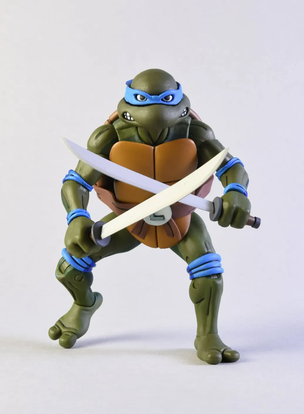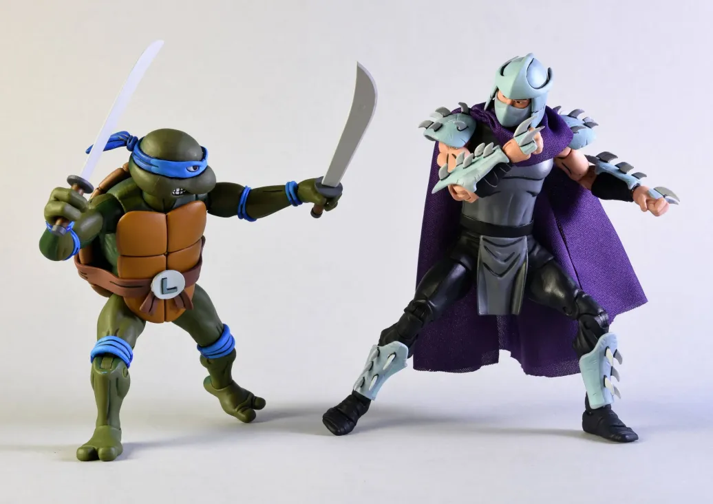 Zur Zeichentrickserie Teenage Mutant Ninja Turtles kommen diese detailreichen Leonardo vs Shredder Actionfiguren. Sie sind ca. 18 cm groß und werden zusammen mit weiterem Zubehör in einer Fensterbox geliefert.