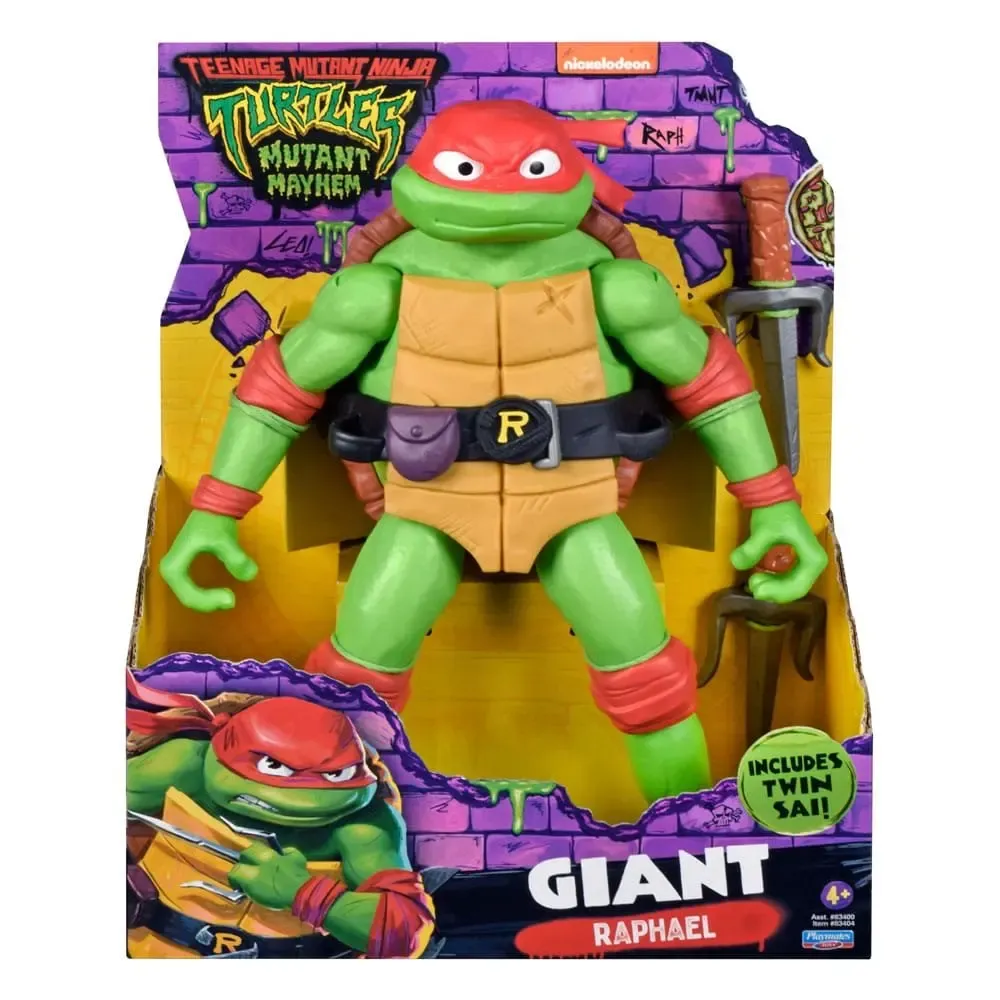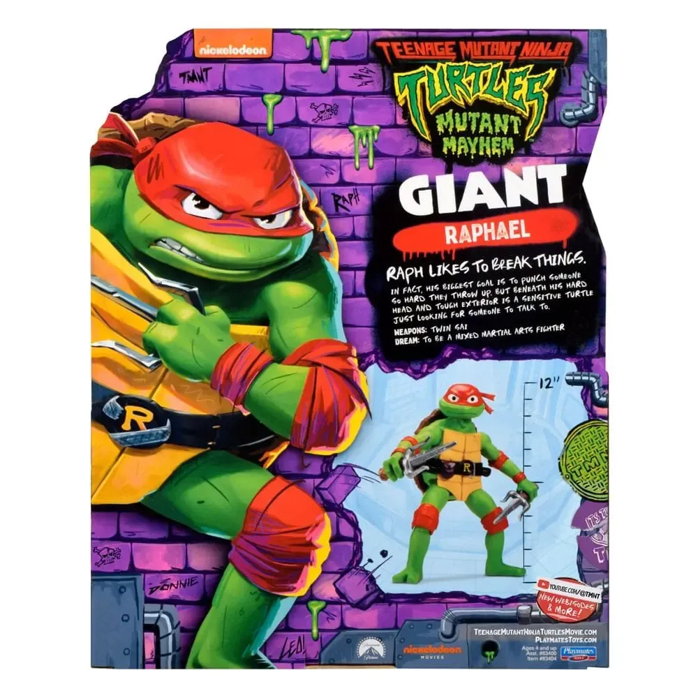 Cowabunga! Die Teenage Mutant Ninja Turtles sind zurück! 2 gleichermaßen starke Teenager Helden mit unvergleichlichen Fähigkeiten im Kampf Gut-gegen-Böse! Set besteht aus einer ca. 30 cm großen, gigantischen Actionfigur, inkl. Waffe im filmgetreuen Design. Sortiment: Leonardo, Raphael