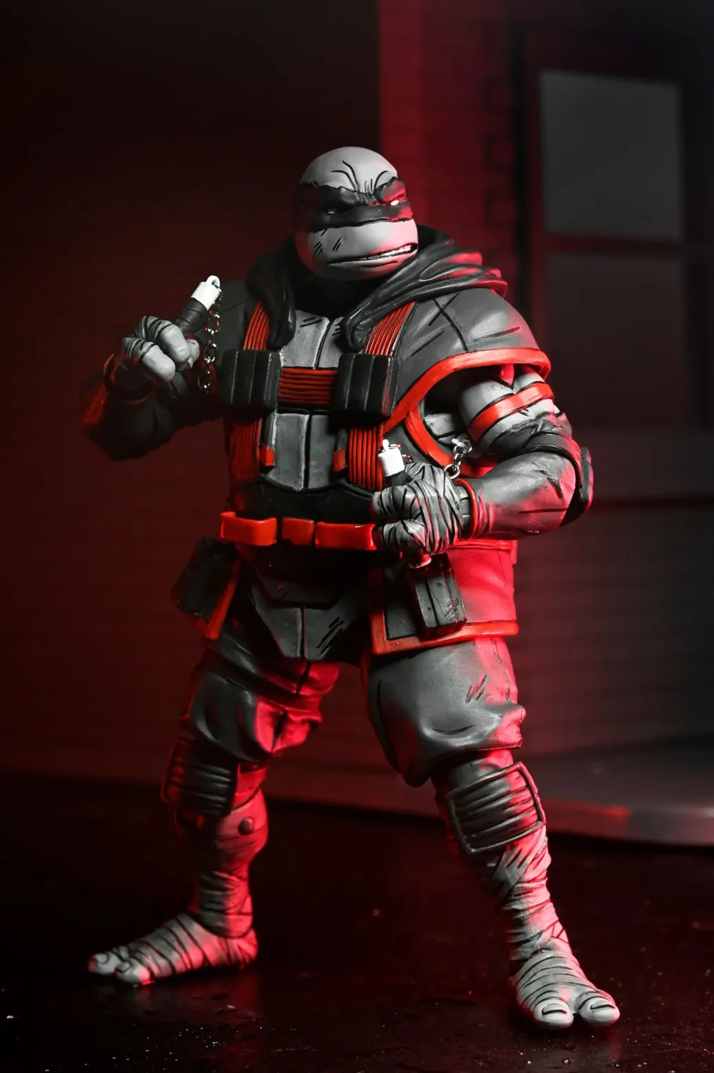 Zu einer der verschiedenen Comic-Varianten von Teenage Mutant Ninja Turtles kommt dieses coole Actionfigur. Sie ist ca. 18 cm groß und wird mit weiterem Zubehör in einer Fensterbox geliefert.