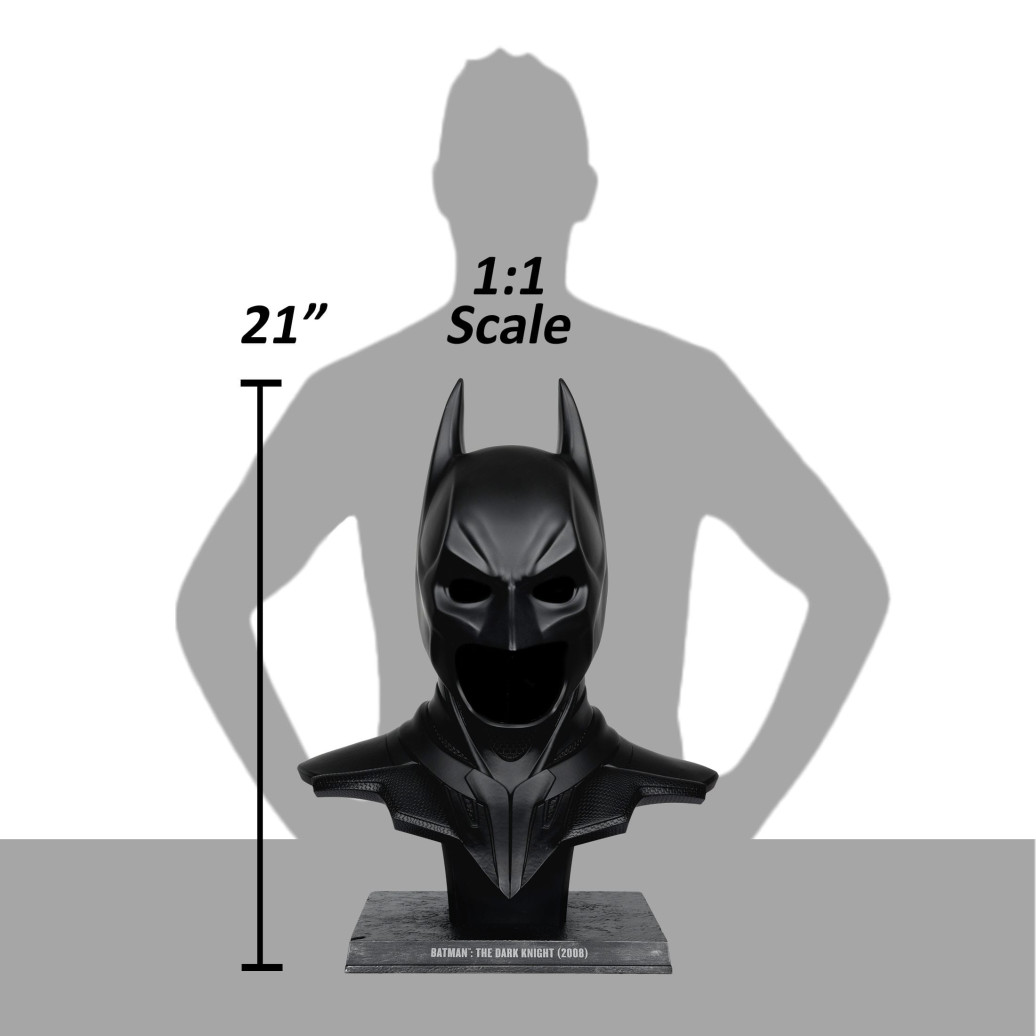 Aus der "DC Direct" Reihe kommt diese detailreiche Nachbildung der Batman-Maske in Originalgröße. Das reine Dekorationsobjekt (Maske kann nicht getragen werden) ist ca. 62 cm groß und kommt mit einem Ständer zur ansprechenden Präsentation.