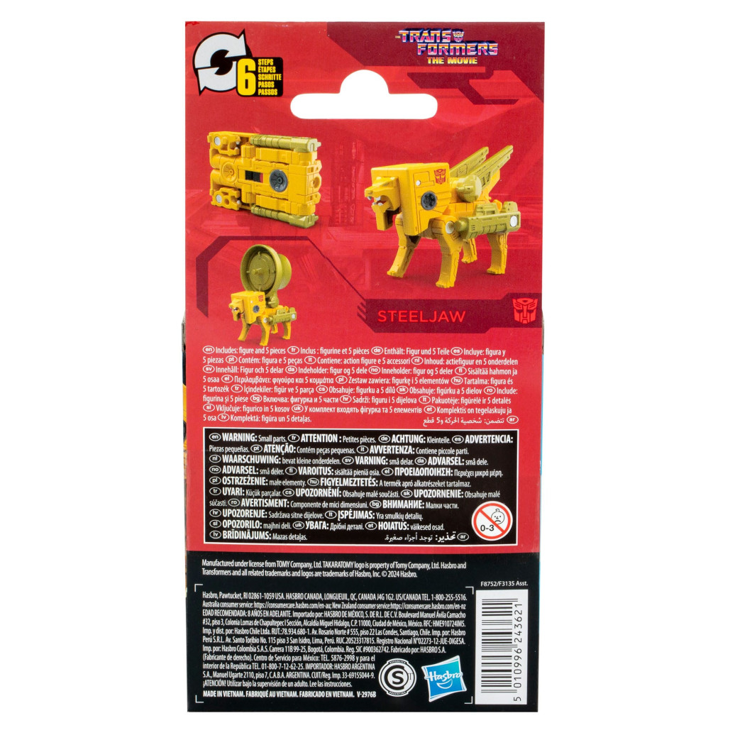 Mit der Core-Klasse Steeljaw Action-Figur aus der Transformers Studio Series zu Transformers - Der Kampf um Cybertron lässt sich die Action der Transformers Filme von der Kinoleinwand in die eigene Sammlung nach Hause holen! Spielzeuge aus der Transformers Studio Series umfassen Action-Figuren zum Sammeln, die im detailgetreuen Look und mit Accessoires zum Film aufwarten. Die Action-Figur kann in 6 Schritten vom Löwen in eine Kassette verwandelt und mit den enthaltenen Flügel- und Lautsprecher-Accessoires in Szene gesetzt werden. Es gibt noch mehr Sammelfiguren aus der Transformers Studio Series (jeweils separat erhältlich, je nach Verfügbarkeit), um eine auf dem Film basierende Sammlung aufzubauen.