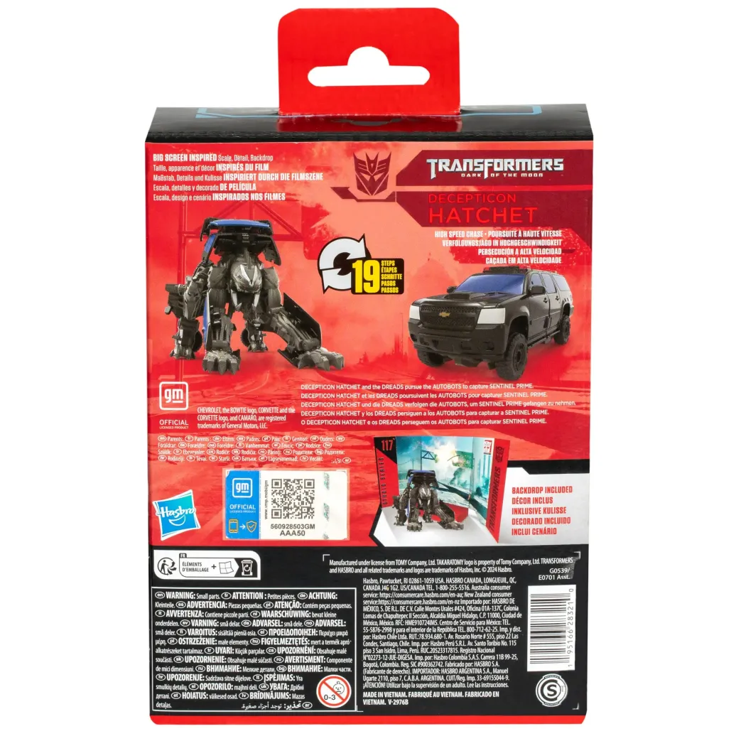 Mit der Deluxe-Klasse Decepticon Hatchet Action-Figur aus der Transformers Studio Series zu Transformers: Die dunkle Seite des Mondes lässt sich die Action der Transformers Filme von der Kinoleinwand in die eigene Sammlung nach Hause holen! Spielzeuge aus der Transformers Studio Series umfassen Action-Figuren zum Sammeln, die mit Details und Zubehör im Look zum Film aufwarten. Die Action-Figur aus der Transformers Studio Series lässt sich in 19 Schritten vom Roboter in einen Chevrolet Suburban verwandeln. Mit der enthaltenen, abnehmbaren Kulisse kann das Decepticon Hatchet Spielzeug in der Szene "Verfolgungsjagd in Hochgeschwindigkeit" dargestellt werden. Es gibt noch mehr Sammelfiguren aus der Transformers Studio Series (jeweils separat erhältlich, je nach Verfügbarkeit), um eine vom Film inspirierte Sammlung aufzubauen.