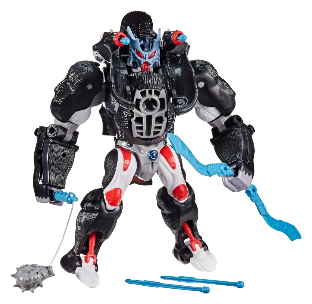 Die Optimus Primal Figur kommt mit einem Morgenstern, 2 Cyber Blades und 4 Raketen. Sie kann in 7 Schritten vom Gorilla in einen Roboter verwandelt werden.
