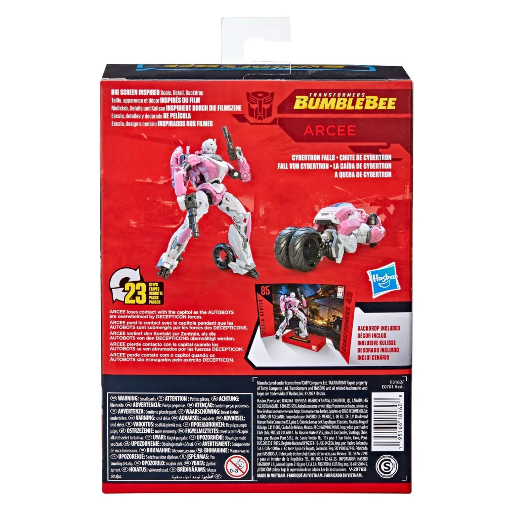 Diese durch Transformers: Bumblebee inspirierte 85 Deluxe-Klasse Arcee Figur aus der Studio Series kann in 23 Schritten von einem Roboter in ein cybertronisches Motorrad verwandelt werden. Enthält 2 Blaster-Accessoires, die sich in beiden Modi anbringen lassen. Durch das Entfernen der Kulisse kann Arcee in der "Fall von Cybertron"-Szene präsentiert werden. In dieser Szene aus Transformers: Bumblebee verliert Arcee den Kontakt zur Zentrale, als die Autobots von den Decepticons überwältigt werden. Mit den enthaltenen Blaster-Accessoires kann Arcee posiert werden, um diesen klassischen Filmmoment wiederzubeleben!