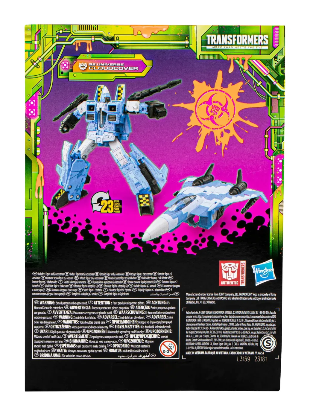 Mit der G2 Universe Cloudcover Action-Figur können die Fans einen Sturm toxischer Verwüstung inszenieren. Die Transformers Action-Figur für Jungen und Mädchen ist von den ursprünglichen Farbdesigns der G2 Spielzeuglinie aus den 90er Jahren inspiriert. Das leuchtende Farbkonzept dieses Transformers Spielzeugs fällt in der Sammlung eines jeden Fans definitiv auf! Diese G2 Universe Cloudcover Spielfigur ist ein tolles Geschenk für Transformers Fans und Sammler. Zur Ergänzung der eigenen Sammlung gibt es noch weitere Transformers Legacy Spielzeuge. (Jeweils separat erhältlich, je nach Verfügbarkeit.)