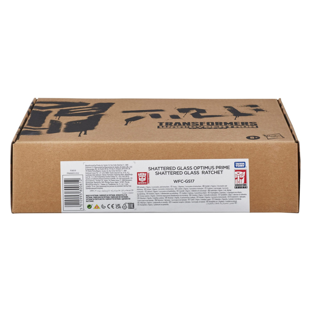 Diese Sonder-Edition WFC-GS17 Shattered Glass Ratchet und Optimus Prime Figuren sind von den gemeinsam mit IDW kreierten Shattered Glass Comics inspiriert, die ein alternatives Universum zeigen, in dem die heldenhaften Decepticons gegen die bösen Autobots antreten. Diese Figuren zeigen den fiesen Autobot Anführer und den verrückten Autobot Sanitäter mit einem durch die Comics inspirierten Design und lilafarbenen Autobot Logos.