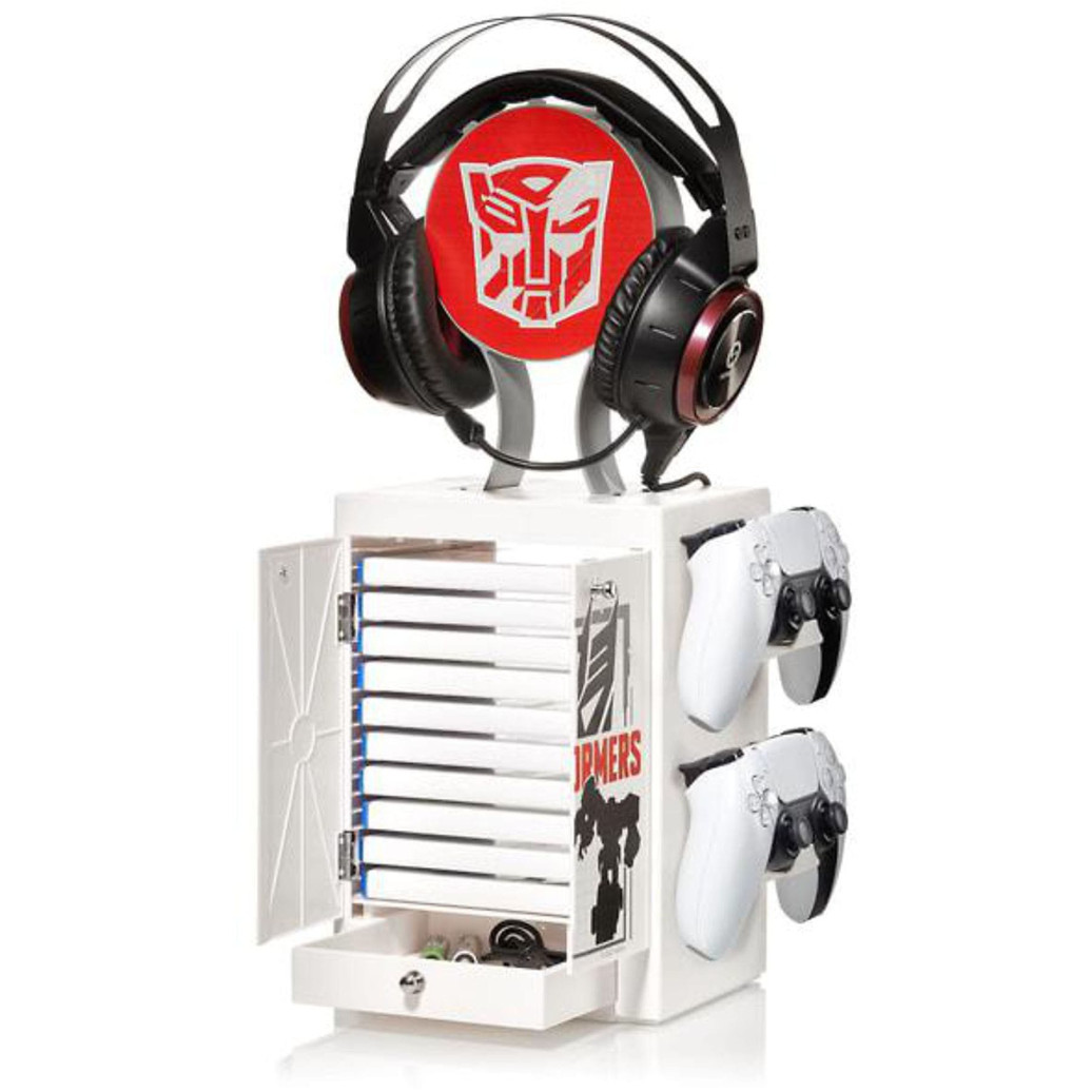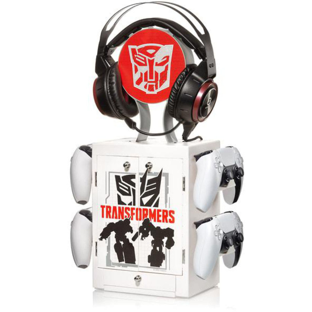 Transform your gaming space from untidy to tidy with this awesome Transformers gaming locker! Offering a storage solution for up to 10 of your favourite Xbox One/Xbox Series X-S games, PS4/PS5 games or movies, the locker also provides side mounts to allow up to four control pads to be neatly stored away. Cables, thumb grips and other gaming bits can be placed in the handy drawer in the base whilst headphones can be placed on the dedicated mount on the top of the unit. Features: - Official Transformers product - Designed and engineered by Numskull Designs - Holds up to 10 PS4/PS5/Xbox games and movie - Hang up to 4 controllers - Securely holds your headphones on the top - Bottom draw for cables, remotes and other equipment - Front doors that open and close, with cool Transformers branding