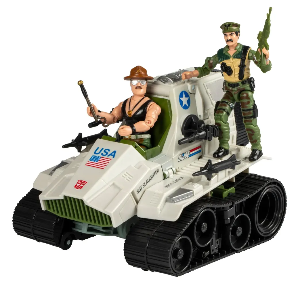 Bei dem Transformers x Autobot Kup Triple T Mash-up Pack treffen die Welten der Transformers Roboter und der G.I. Joe Figuren und Fahrzeuge aufeinander! Die 22,8 cm große Autobot Kup Action-Figur lässt sich in 34 Schritten vom Roboter-Spielzeug in ein G.I. Joe Triple T Panzer-Spielzeug verwandeln. Das Fahrzeug ist dem kultigen Triple T-Panzer nachempfunden und verfügt über seriengetreue Deko und Details aus der klassischen G.I. Joe Zeichentrick- und Comicserie. Die Transformers Figur gibt es zusammen mit den G.I. Joe Action-Figuren Sgt. Slaughter und Leatherneck (9,5 cm). Der Pack enthält detailliertes Zubehör zum Darstellen von Action-Posen. Transformers Roboter faszinieren schon immer mit der Power der Verwandlung, aber jetzt können die Fans erleben, wie sich diese herausragenden Charaktere dank der Transformers Collaborative mit anderen Charakteren, Teams und Personen zusammentun, die genauso beeindruckend sind.
