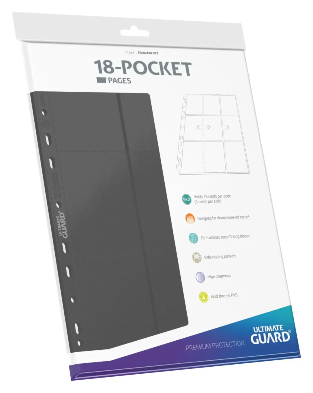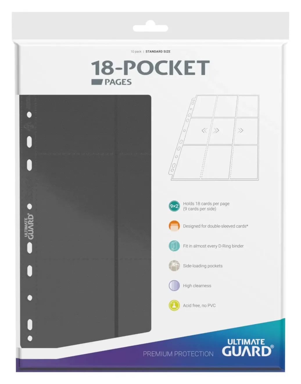 Hochwertige, doppelseitige Ordnerseiten (18 Taschen, 9 Taschen je Vorder- und Rückseite), passend für nahezu jeden Ringordner dank 11er-Lochung mit doppelt verstärkter Lochleiste. Jeder Pack enthält 10 Seiten für den Transport und die sichere Aufbewahrung von insgesamt mindestens 180 Karten (18 je Page) in zwei Hüllen (double-sleeved).