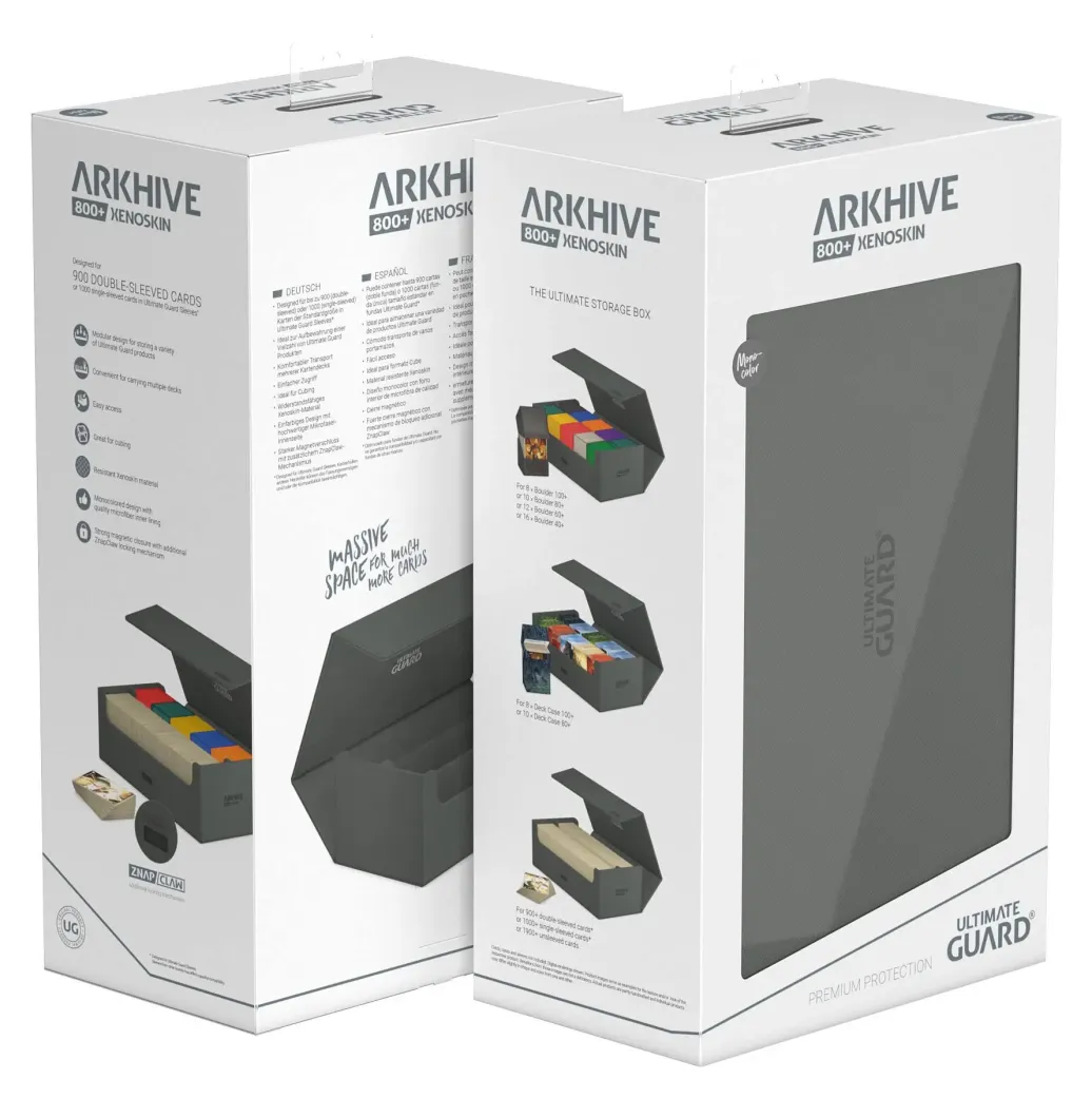 Verdopple deinen Stauraum mit unserem Arkhive 800+! Diese Box bietet Platz für mehr als 800 Karten double-sleeved in Standardgröße und kann bis zu 350 Toploader aufnehmen. Oder du füllst die beiden Reihen des Hives einfach mit einer Auswahl deiner bevorzugten Deckboxen. Das einfarbige Farbschema bietet ein stilvolles und zeitloses Design für Gamer und Sammler und der innovative ZnapClaw-Verschluss schützt deine Karten auf allen deinen Reisen.