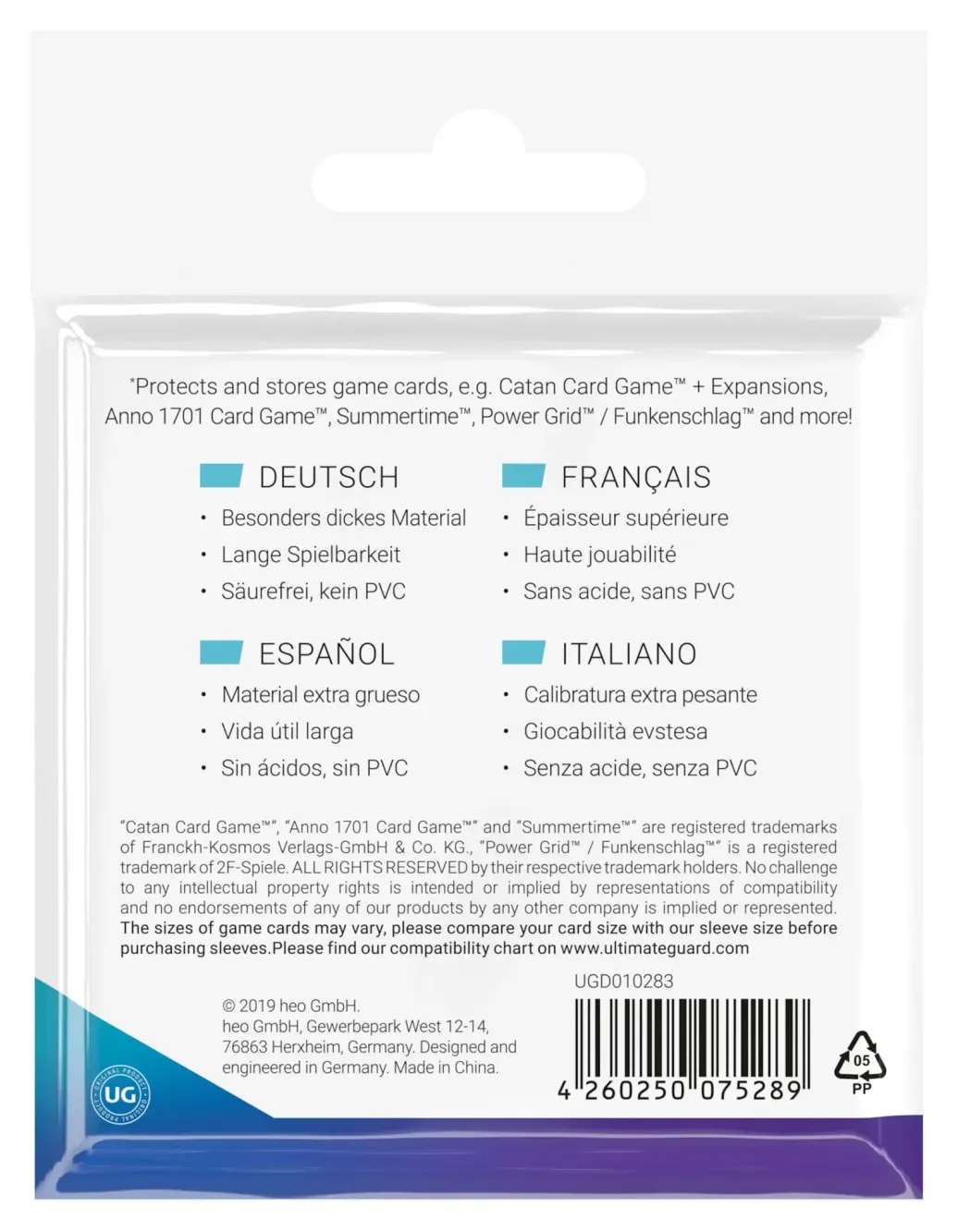 Der Pack enthält 50 hochwertige Kartenhüllen zur Aufbewahrung und zum Schutz von quadratischen Brettspielkarten, passend für Spiele wie Catan Card Game™ + Expansions, Anno 1701 Card Game™, Summertime™, Power Grid™ / Funkenschlag™ und weitere.