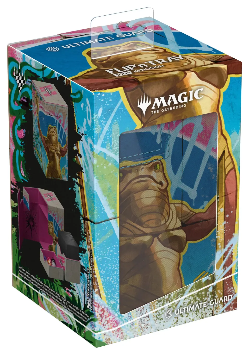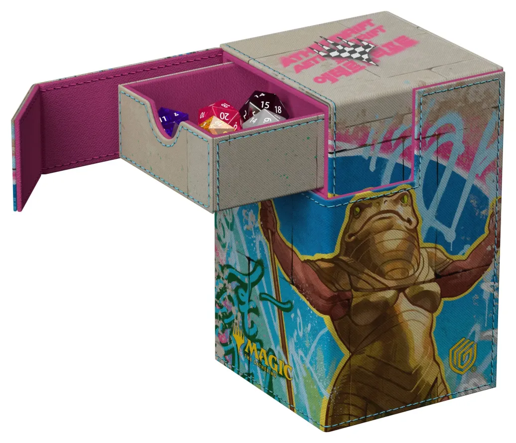 Ultimate Guards Flip'n'Tray 100+ Xenoskin trifft erstmals auf offiziell lizensierte Artworks aus Magic: The Gatherings Aetherdrift: Die Deck-Box aus vollfarbig bedrucktem, resistenten Xenoskin-Material bietet nicht nur Platz für 100 doppelt gesleevete Karten (120 single-sleeved), sondern auch ein integriertes Würfelfach. Zur sicheren Verwahrung von TCG-Decks und Zubehör hat der Flip'n'Tray 100+ Xenoskin zuverlässige und starke Magnetverschlüsse.