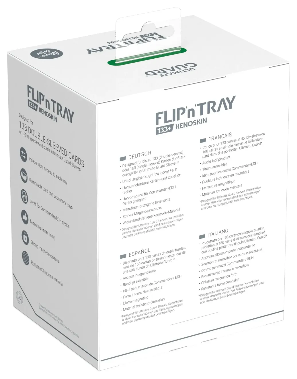 Die neueste Version des legendären Flip'n'Tray von Ultimate Guard bietet noch mehr Platz: In den Flip'n'Tray 133+ Xenoskin passen bis zu 133 doppelt gesleevete Karten, dank des integrierten Extrafachs für Würfel eignet sich die Deck-Box perfekt für Commander/EDH-Decks oder ist der optimale Begleiter für Magic: The Gathering-Spieler auf Limited-Events. Doch auch Fans anderer TCGs wie Pokémon oder Flesh and Blood werden die geräumige und praktische Deck-Box mit unserer bewährten Xenoskin-Oberfläche lieben!