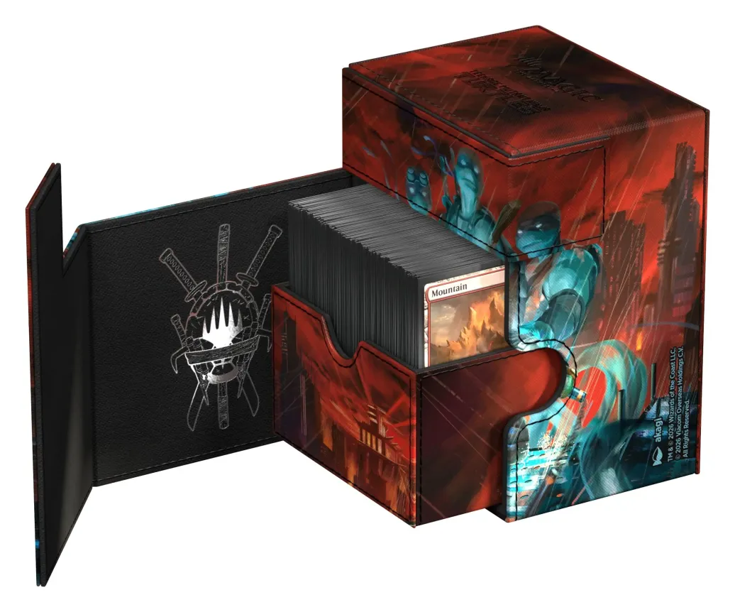 Ultimate Guards Flip'n'Tray 133+ Xenoskin ist eine Premium-MTG-Deck-Box für alle Magic-Formate (Commander/EDH, Modern, Standard, usw.) mit zwei unabhängig voneinander zugänglichen Fächern: eines für 133 doppelt gesleevte Karten in Ultimate Guard-Hüllen* und eines für Würfel und Zubehör. Bedruckt mit offiziell linzensierten Artworks aus dem "Magic: The Gathering | Teenage Mutant Ninja Turtles"-Set garantiert der Flip'n'Tray dank seines widerstandsfähigen Xenoskin-Materials, einer Mikrofaserinnenseite und starker Magnetverschlüsse herausragenden Kartenschutz. Der Flip'n'Tray 133+ kann auch als Aufbewahrungsbox für einen Boulder 100+ verwendet werden, wenn das Kartenfach entfernt wird.