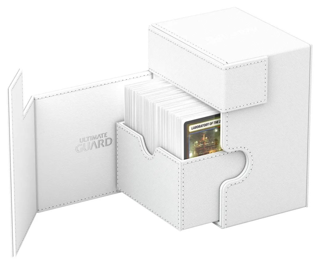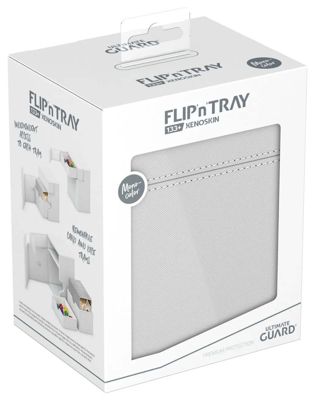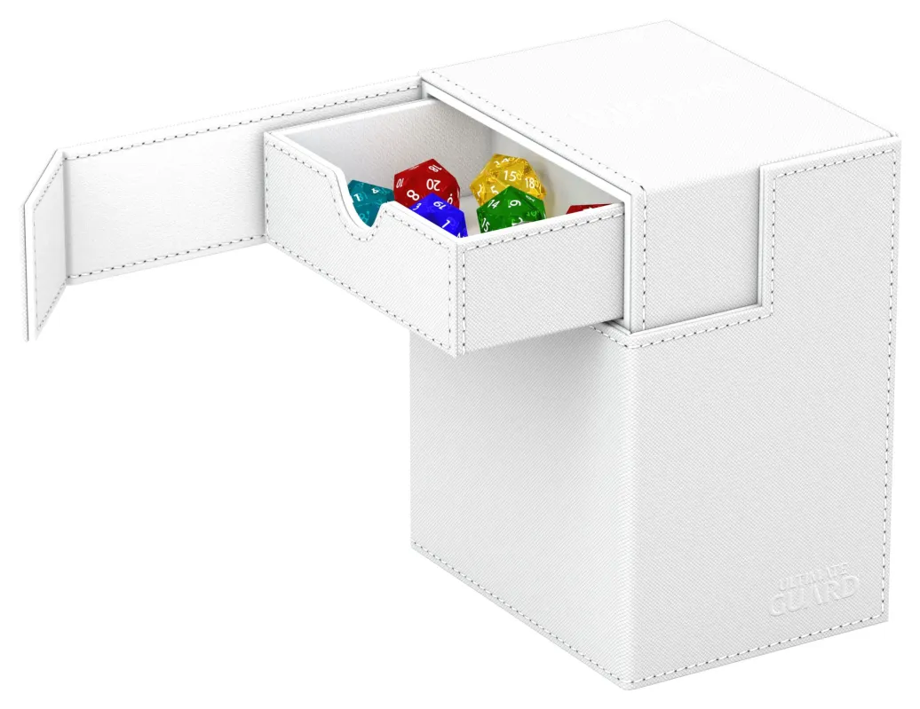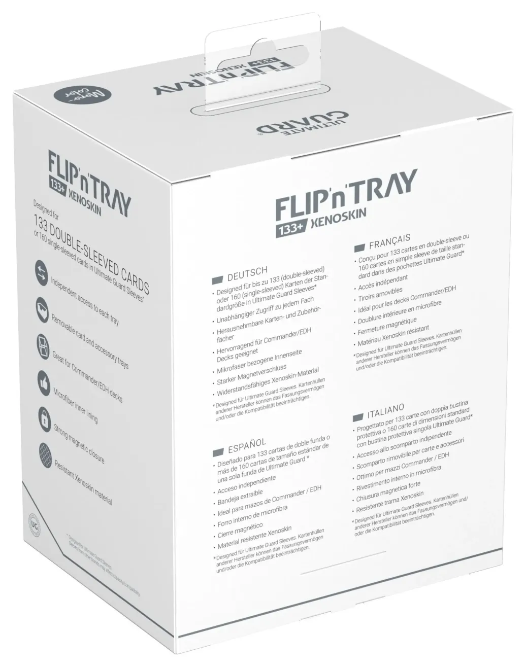 Die neueste Version des legendären Flip'n'Tray von Ultimate Guard bietet noch mehr Platz: In den Flip'n'Tray 133+ Xenoskin passen bis zu 133 doppelt gesleevete Karten, dank des integrierten Extrafachs für Würfel eignet sich die Deck-Box perfekt für Commander/EDH-Decks oder ist der optimale Begleiter für Magic: The Gathering-Spieler auf Limited-Events. Doch auch Fans anderer TCGs wie Pokémon oder Flesh and Blood werden die geräumige und praktische Deck-Box mit unserer bewährten Xenoskin-Oberfläche lieben!