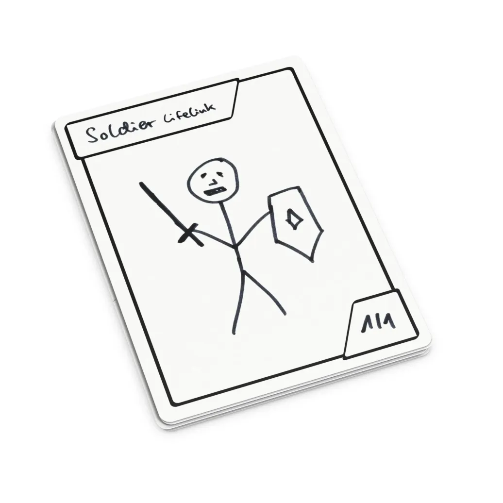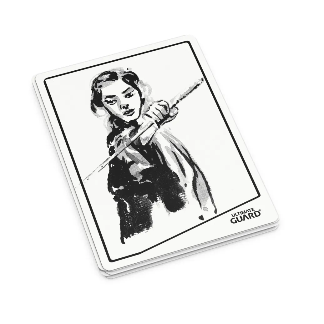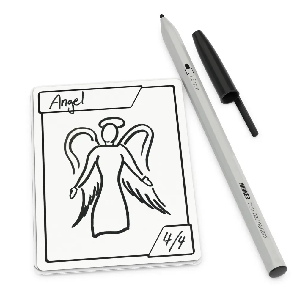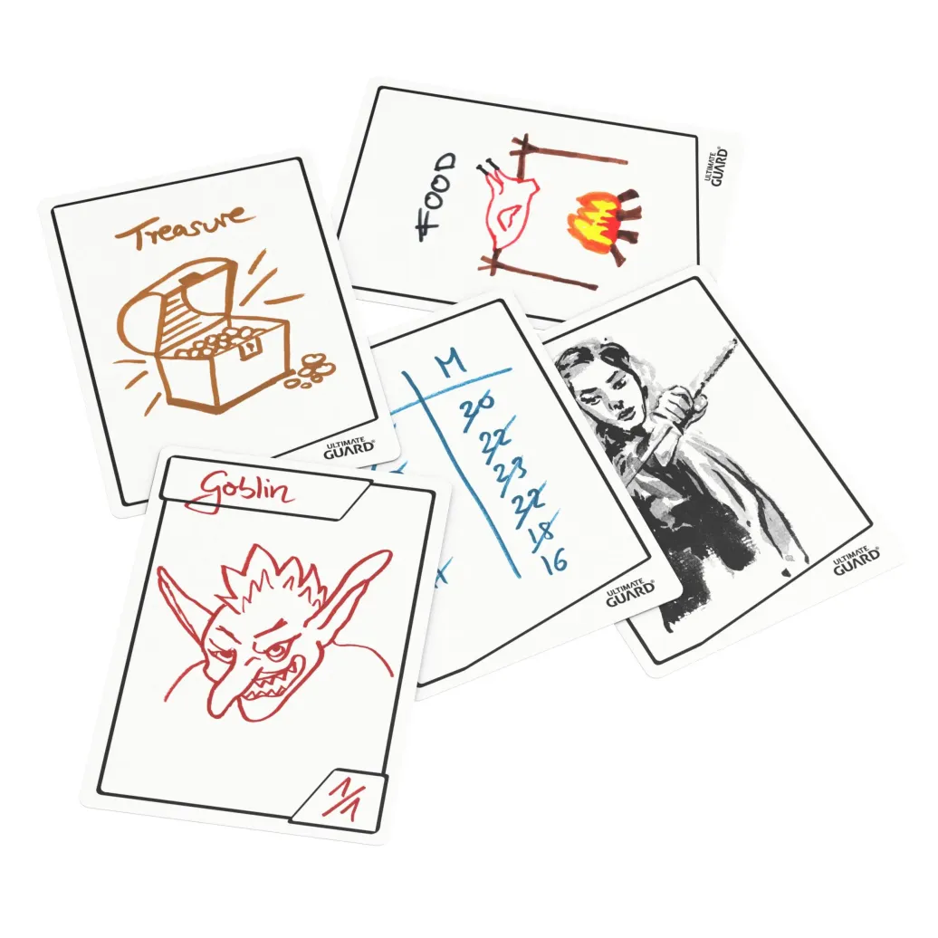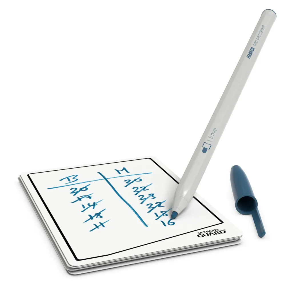 - Sleeven: Verwende einen wasserlösslichen Stift für widerstandsfähigere Zeichnungen oder um die Tokens zu sleeven. Zur Wiederverwendung einfach mit einem feuchten Handtuch oder ein paar Tropfen Reinigungsalkohol abwischen.