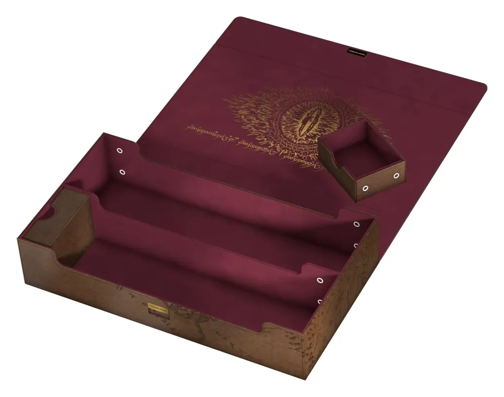 Der Omnihive 1000+ ist designt, um mehrere Deck-Boxen, Würfel und/oder Play-Mats gleichzeitig zu verstauen und verfügt über zwei flexibel positionierbare, magnetische Zubehörfächer. Die Massenaufbewahrungsbox aus der offiziellen The Lord of the Rings™ "Places of Middle-earth"-Edition besteht aus hochwertigem Kunstleder und ist die perfekte Wahl, um eine größere Sammlung einzelner Karten (bis zu 1000 doppelt gesleevte Karten) aufzubewahren. Das Innere des Omnihive 1000+ ist mit schonender Mikrofaser ausgekleidet, während ein starker Magnetverschluss mit zusätzlichem ZnapClaw-Mechanismus sicherstellt, dass Karten und Deck-Boxen im Inneren geschützt bleiben.