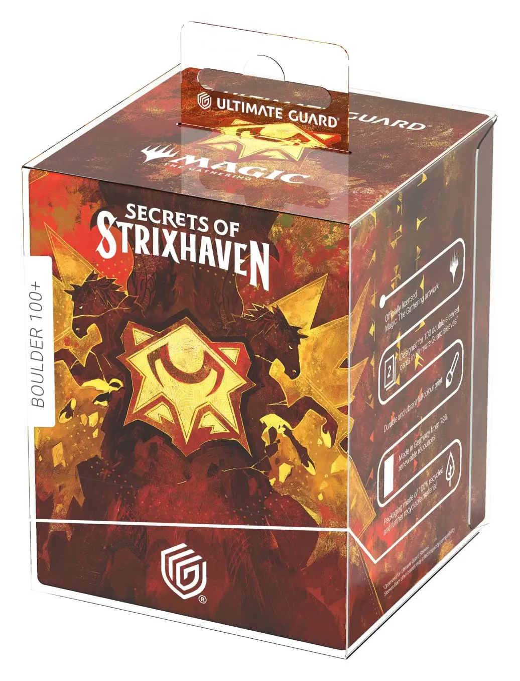 Der RTE Boulder 100+ von Ultimate Guard ist eine robuste und zuverlässige Deck-Box, deren strahlender Vollfarbdruck offiziell lizenzierte Artworks aus dem Magic: The Gathering-Set "Secrets of Strixhaven" zeigt. Trotz seines sicheren Verschlusses lässt sich der RTE Boulder 100+ einfach und bequem öffnen und bietet Platz für 100 doppelt gesleevte Karten (in Ultimate Guard-Hüllen*), was ihn zur idealen Deck-Box für alle Magic-Formate (Commander/EDH, Modern, Standard, usw.) macht. Die MTG-Deck-Box wird in Deutschland aus 78% erneuerbaren Rohstoffen hergestellt und in einer umweltfreundlichen Verpackung aus 100% recyceltem und weiter recycelbarem Material geliefert. Boulder sind mit allen Massenaufbewahrungsboxen von Ultimate Guard kompatibel und lassen sich besonders gut mit Arkhive-, Superhive- und Flip'n'Tray-Boxen kombinieren.