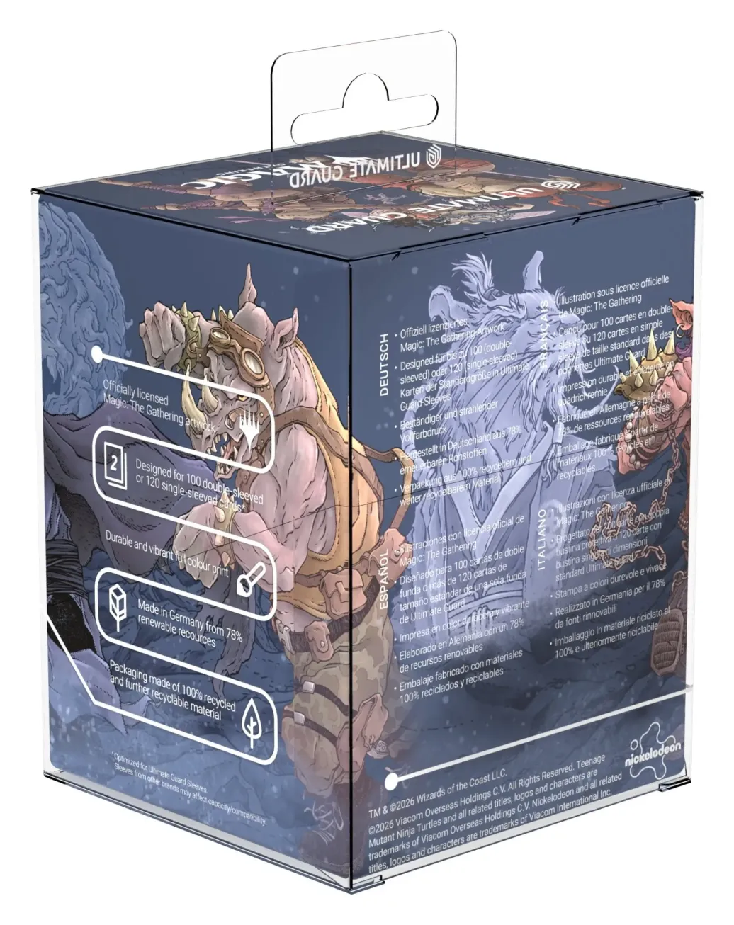 Der RTE Boulder 100+ von Ultimate Guard ist eine robuste und zuverlässige Deck-Box, deren strahlender Vollfarbdruck offiziell lizenzierte Artworks aus dem "Magic: The Gathering | Teenage Mutant Ninja Turtles"-Set zeigt. Trotz seines sicheren Verschlusses lässt sich der RTE Boulder 100+ einfach und bequem öffnen und bietet Platz für 100 doppelt gesleevte Karten (in Ultimate Guard-Hüllen*), was ihn zur idealen Deck-Box für alle Magic-Formate (Commander/EDH, Modern, Standard, usw.) macht. Die MTG-Deck-Box wird in Deutschland aus 78% erneuerbaren Rohstoffen hergestellt und in einer umweltfreundlichen Verpackung aus 100% recyceltem und weiter recycelbarem Material geliefert. Boulder sind mit allen Massenaufbewahrungsboxen von Ultimate Guard kompatibel und lassen sich besonders gut mit Arkhive-, Superhive- und Flip'n'Tray-Boxen kombinieren.