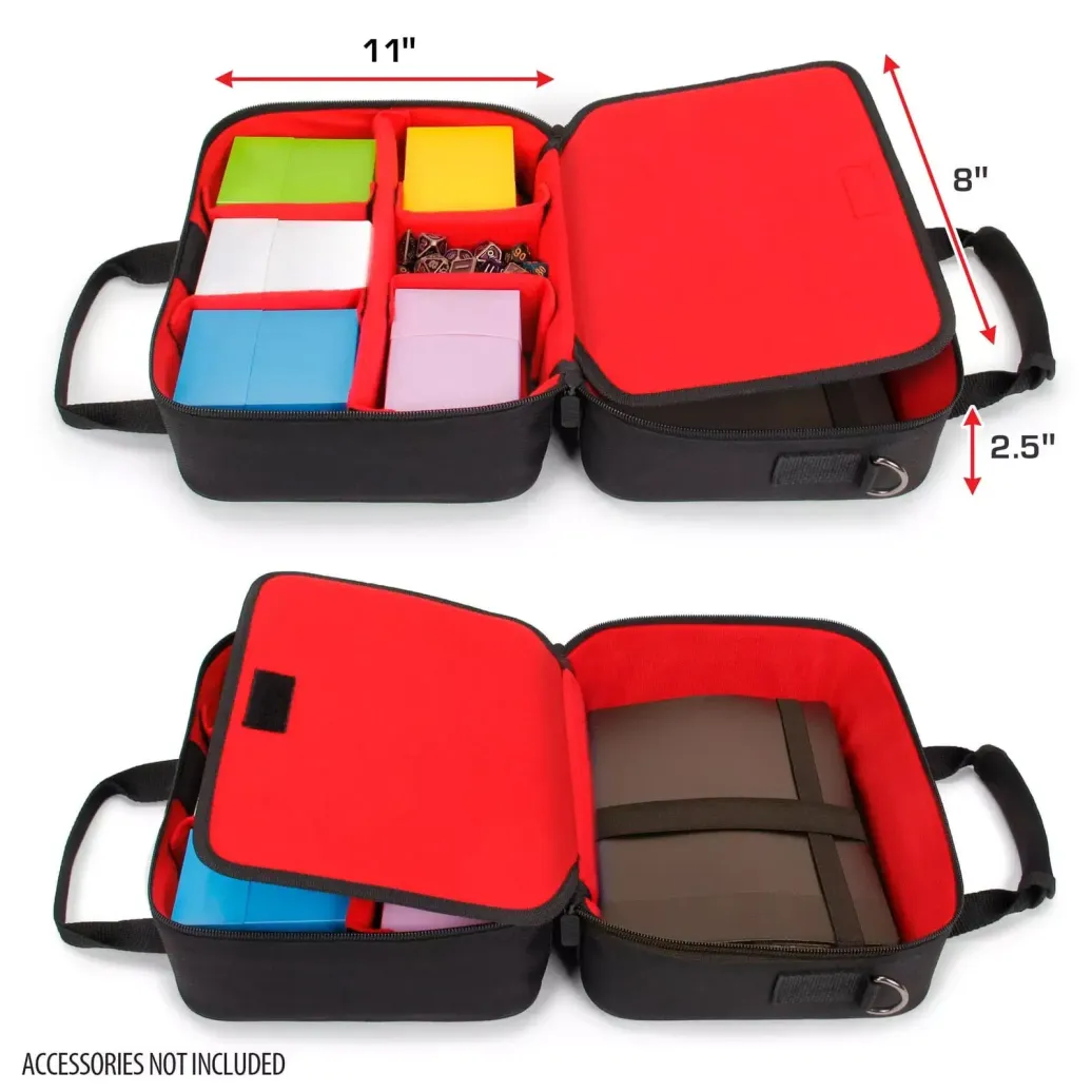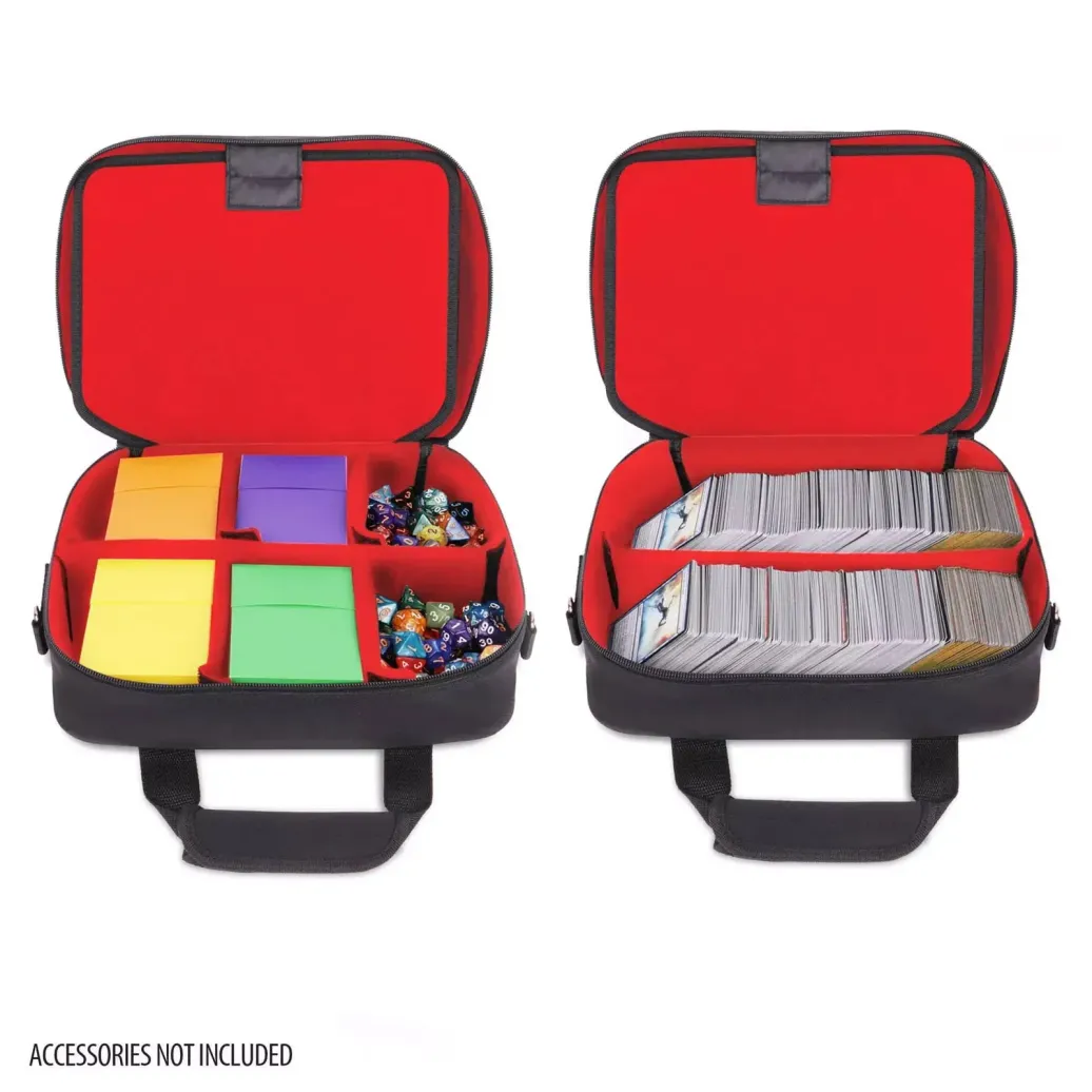 Kartenkoffer mit individuell anpassbaren Fächern für Karten, Spielmatte, Würfel, Notizbücher und weiteres Zubehör.