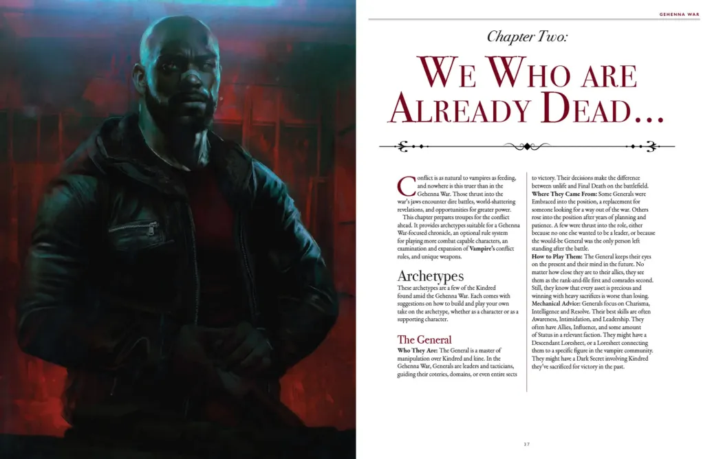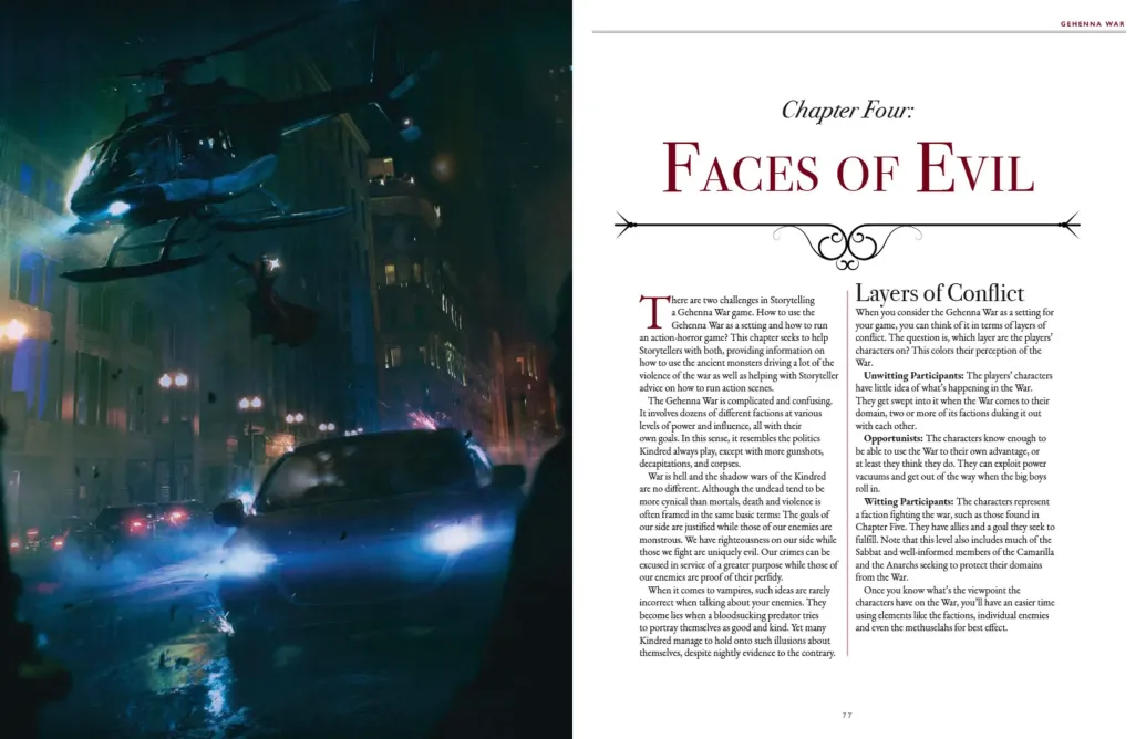 Gehenna War bietet sowohl Spielern als auch Geschichtenerzählern Material, um das Spiel zum Leben zu erwecken, wobei der Schwerpunkt auf rasanten Actionsequenzen und deren Einbindung in Geschichten und Chroniken liegt.