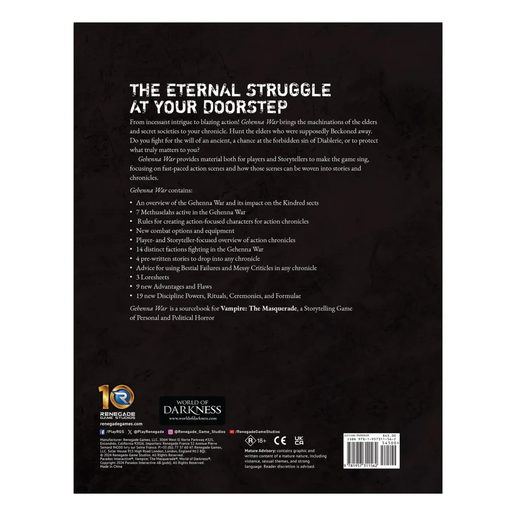 Von unaufhörlichen Intrigen bis hin zu rasanten Action-Szenen! Gehenna War bringt die Machenschaften der Ältesten und Geheimgesellschaften in deine Chronik. Jage die Ältesten, die angeblich weggerufen wurden. Kämpfst du für den Willen eines Urzeitlichen, für eine Chance auf die verbotene Sünde der Diablerie oder um das zu schützen, was dir wirklich wichtig ist?