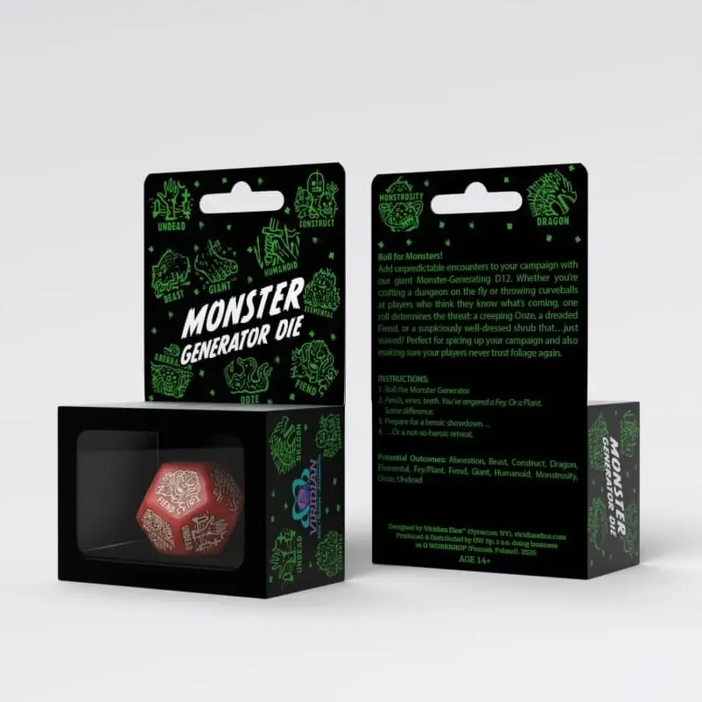 Keine Begegnung vorbereitet? Wir haben die Lösung für Sie! Der Monster Generator Würfel ist ein von Viridian Dice entworfener Jumbo-D12, mit dem Sie ein Monster auf den Weg Ihrer Spieler zaubern können.
