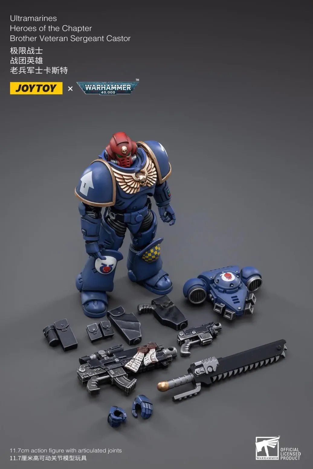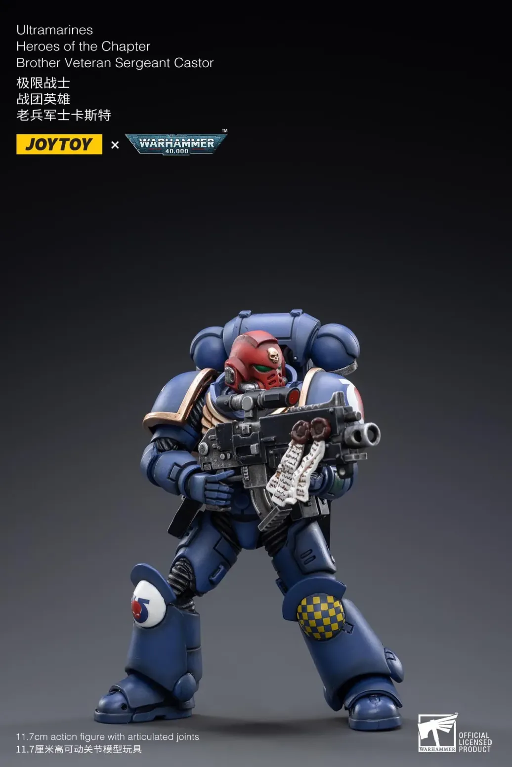 Zum Tabletop-Spiel "Warhammer 40k" kommt diese detailreiche, bewegliche Actionfigur. Sie ist ca. 12 cm groß und wird mit weiterem Zubehör geliefert.