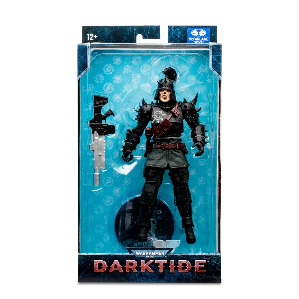 Zum Videospiel "Warhammer 40k: Darktide" kommt diese detailreiche, bewegliche Actionfigur. Sie ist ca. 18 cm groß und wird mit weiterem Zubehör und Base in einer bedruckten Fensterbox geliefert.