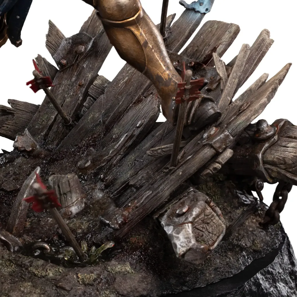 - Dynamische Pose zeigt Neave mitten im Sprint, wie sie von einer zerschmetterten Orruk-Kriegsplattform springt;