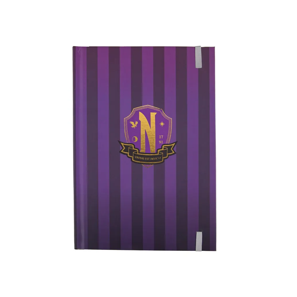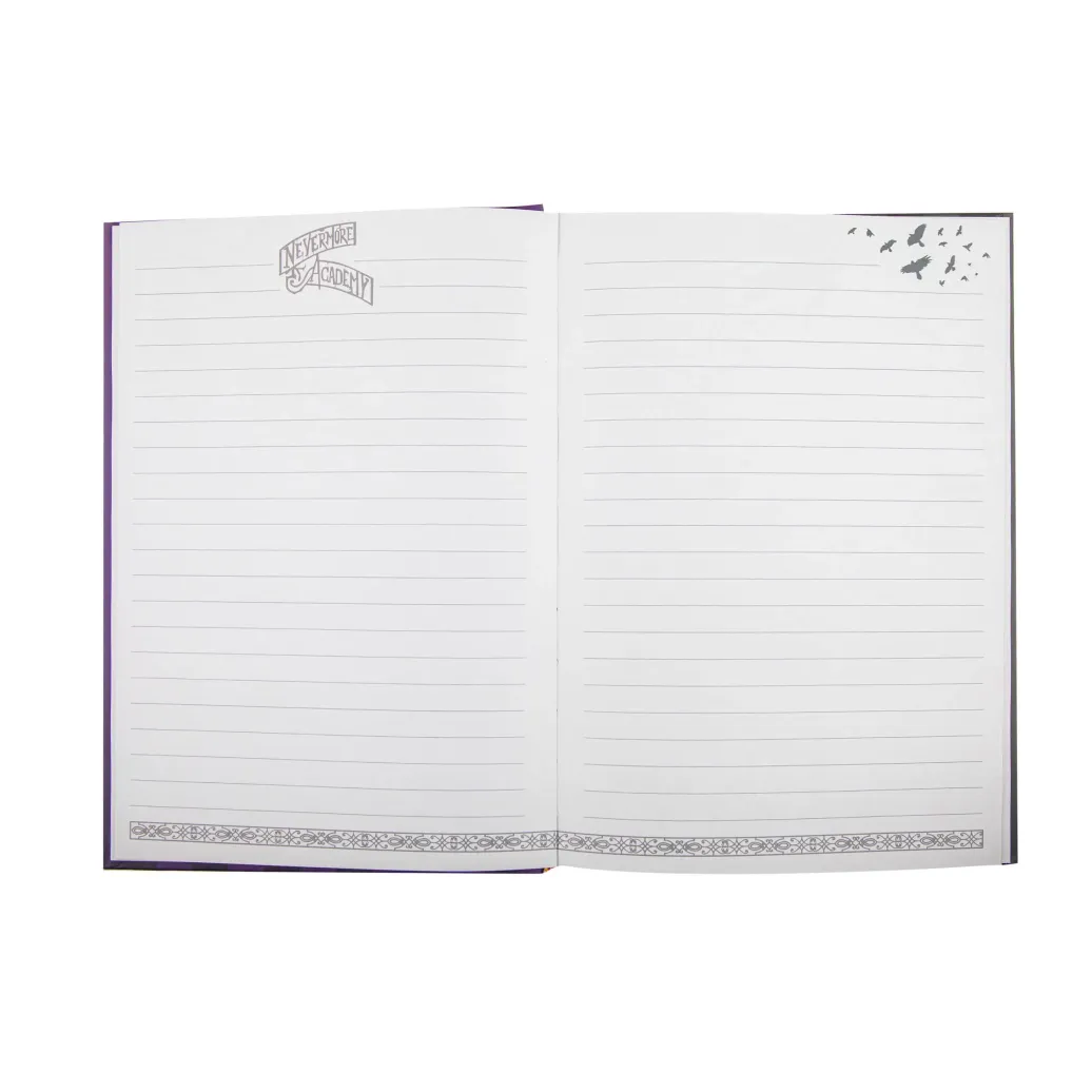 Sowohl die Vorder- als auch die Rückseite dieses Notizbuchs sind mit dem kultigen Nevermore Academy-Logo in der Mitte verziert, aber mit einem einzigartigen Twist. Auf der Vorderseite ist das Logo der Schule in einem schlichten Schwarz und Grau gehalten, wie die Uniform von Wednesday, während die Rückseite in den Farben der Akademie gehalten ist - Lila und Gold. Warten Sie nicht länger und erforschen Sie die Tiefen Ihrer Fantasie!