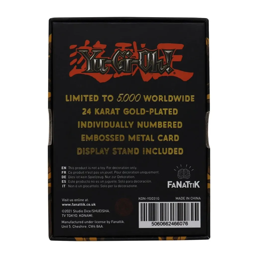 Offiziell lizenzierte Nachbildung einer Karte aus Yu-Gi-Oh!. Das aus vergoldetem Metall hergestellte Sammlerstück ist 7,5 x 5 cm groß und wird in einer schicken Box geliefert.